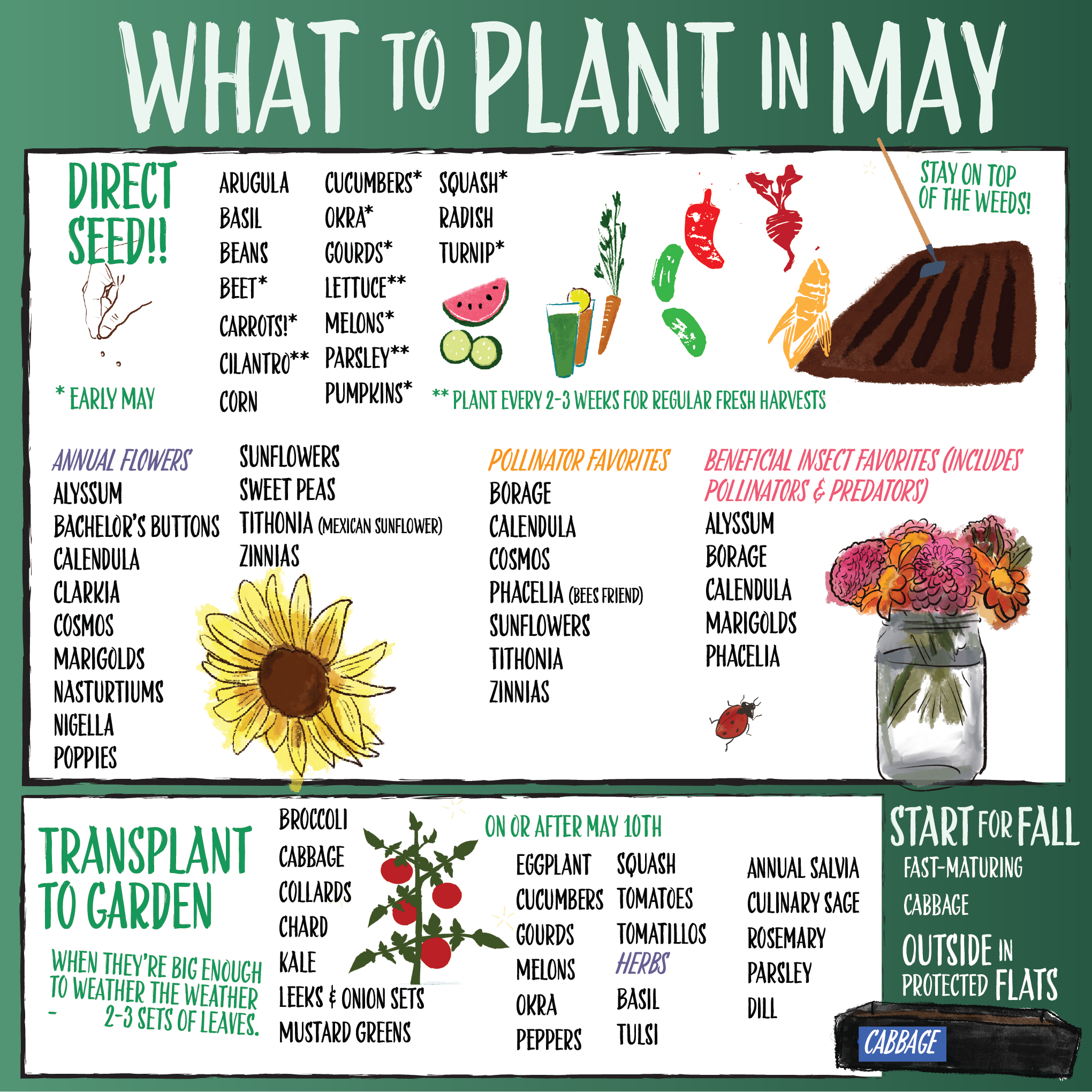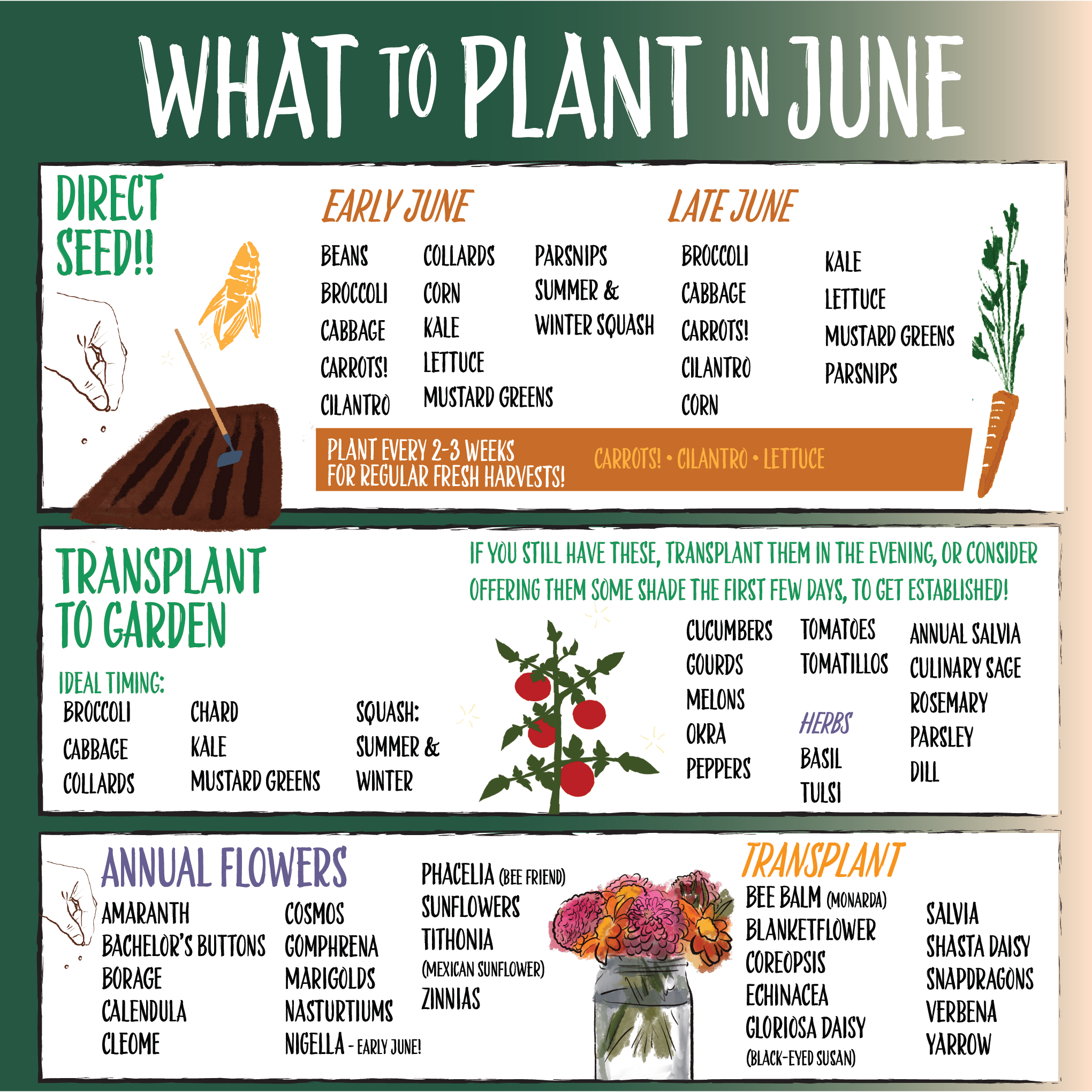 ** Continue to succession sow cilantro, lettuce, and carrots every 2–3 weeks for regular harvests